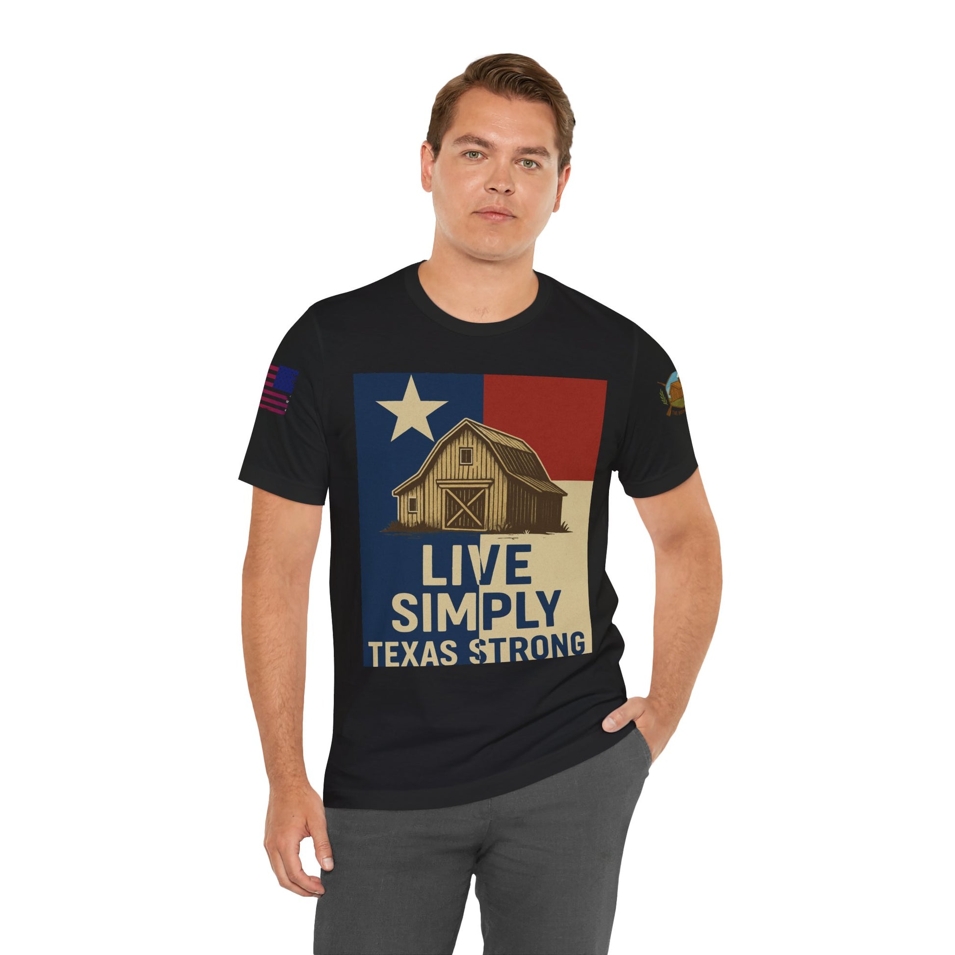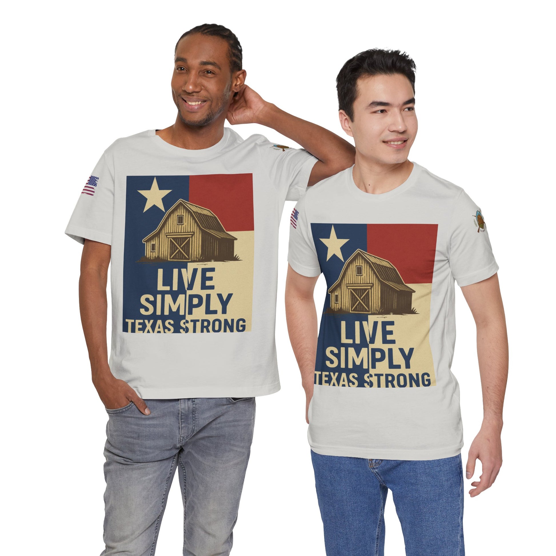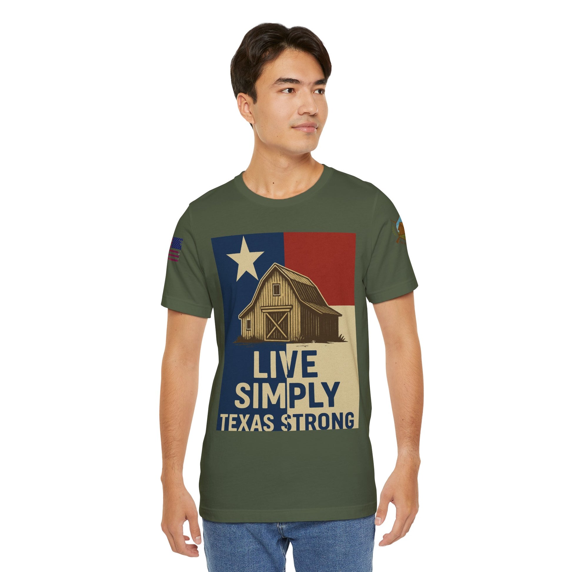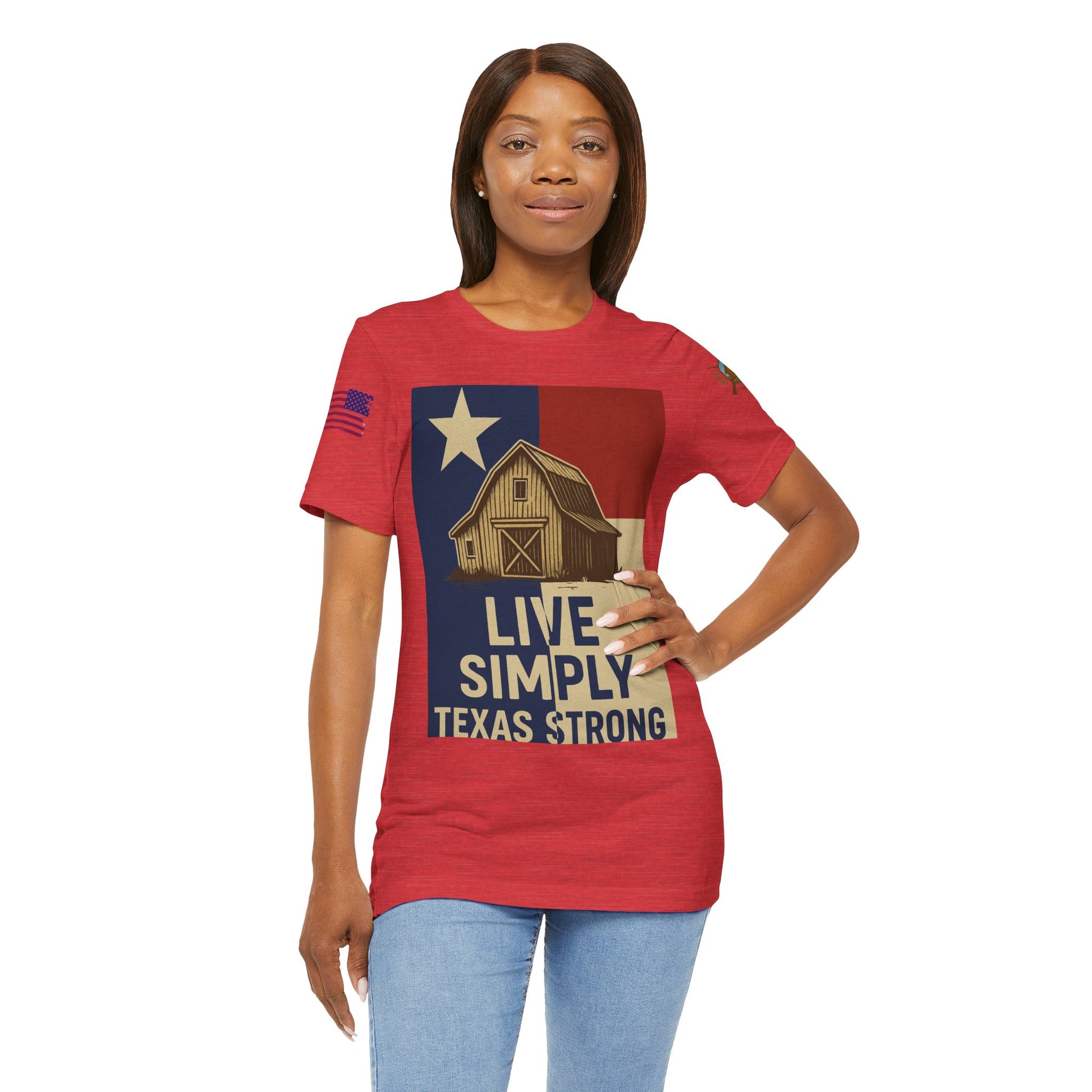 Make a bold statement of faith, grit, and rural pride with the “Live Simply, Texas Strong” t-shirt featuring a rustic barn over the Texas flag and a military-style American flag on the sleeve. Perfect for those who love Texas and want to show their state and country pride. Ideal for casual wear and patriotic holidays.