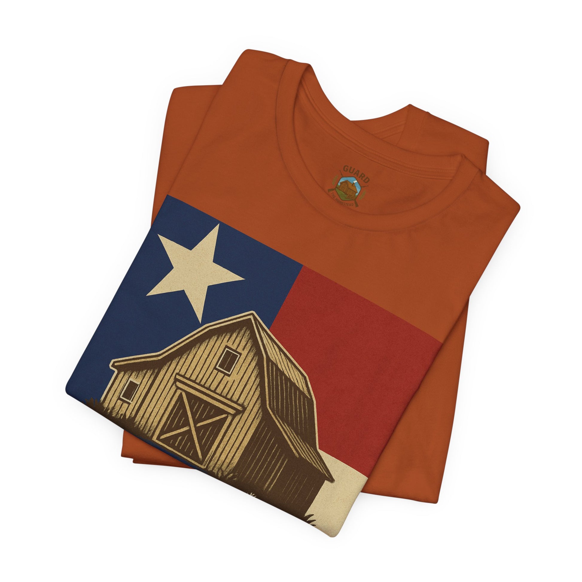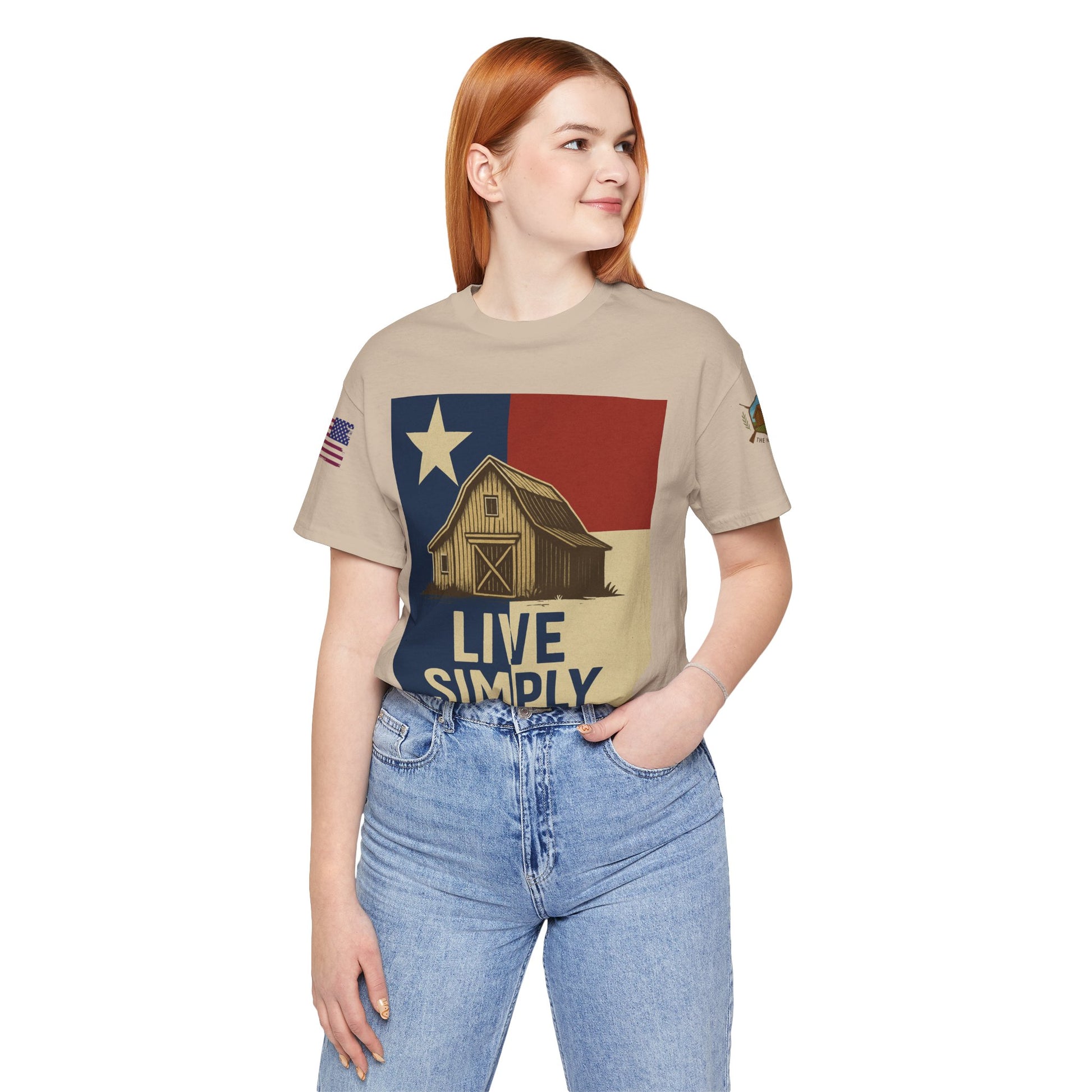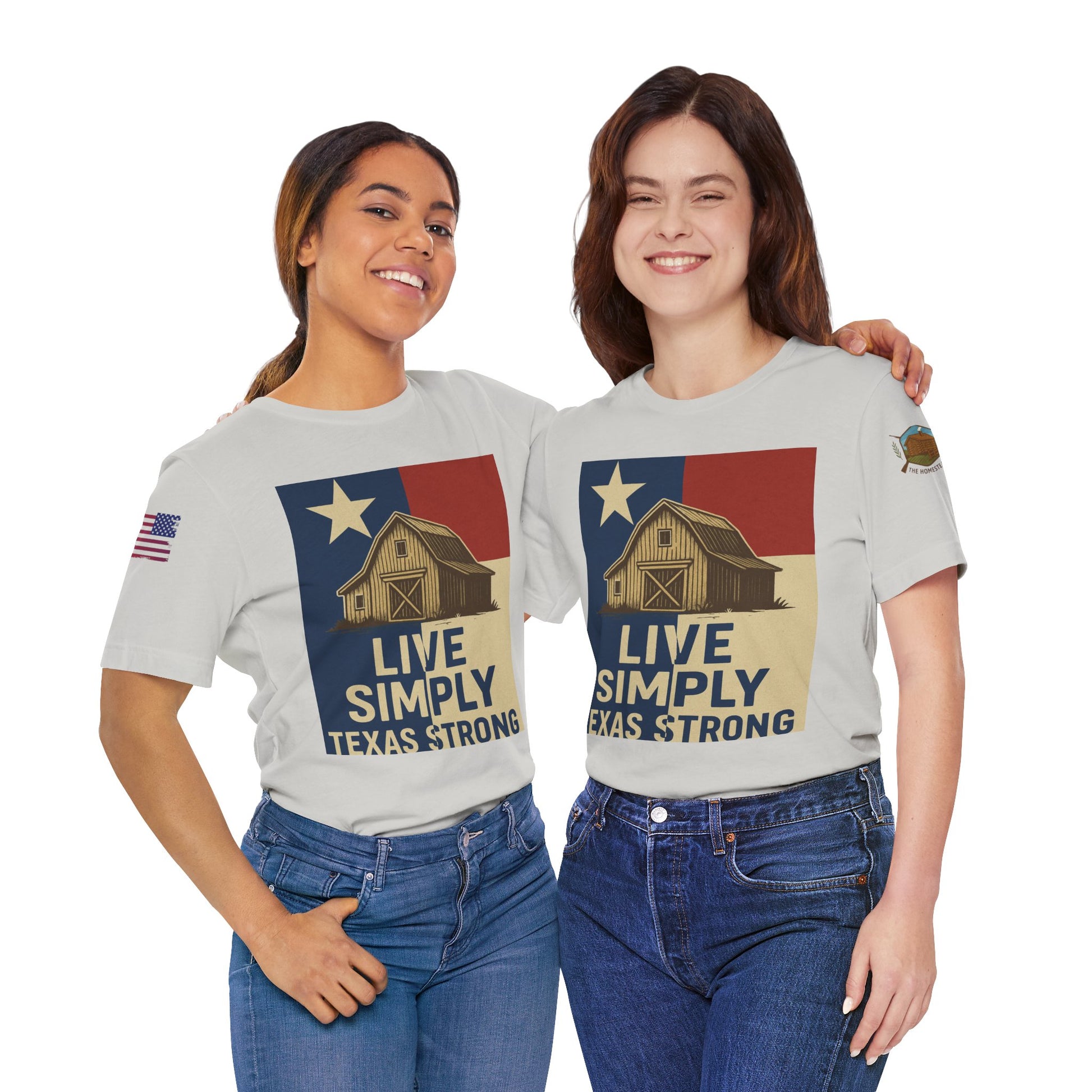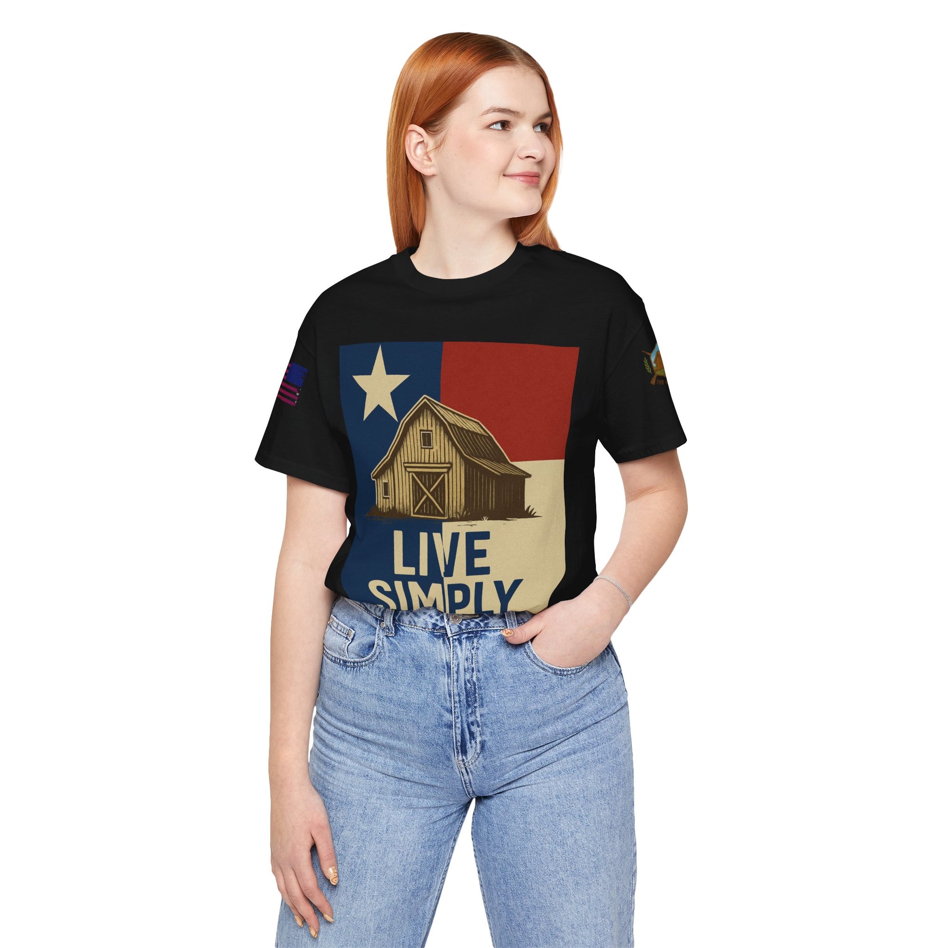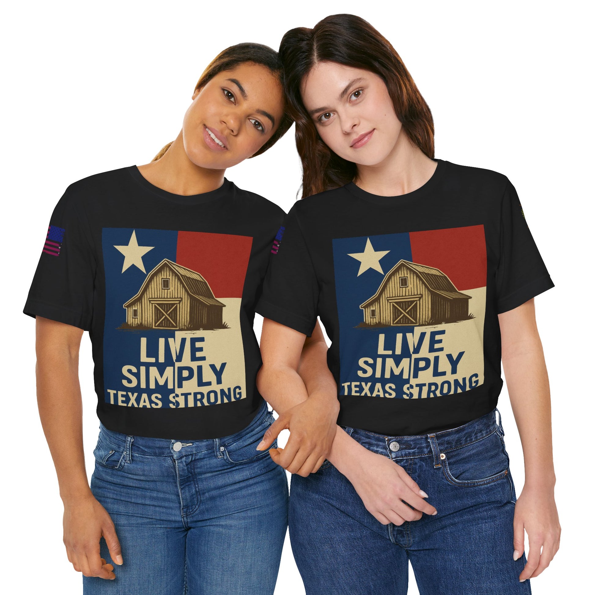 Make a bold statement of faith, grit, and rural pride with the “Live Simply, Texas Strong” t-shirt featuring a rustic barn over the Texas flag and a military-style American flag on the sleeve. Perfect for those who love Texas and want to show their state and country pride. Ideal for casual wear and patriotic holidays.
